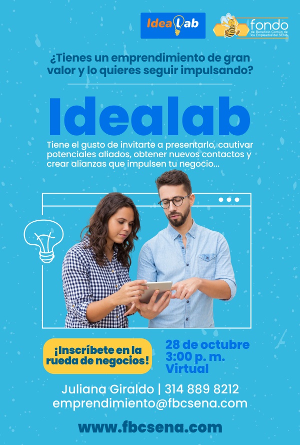 Te quedaron dudas, quieres ampliar información o simplemente deseas formar parte de Idealab, escríbenos a emprendimiento@fbcsena.com y establece contacto con Juliana Giraldo, consultora de emprendimiento del proyecto.